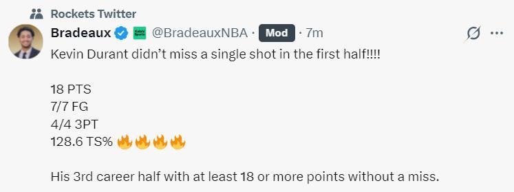 第二節杜蘭特只打了8分多鐘,他看阿門、申京、謝潑德發揮都不錯主動讓渡球權,第二節只有2次出手全部命中,半場7中7,三分4中4,拿到18分4籃板1助攻2蓋帽,真實命中率高達128.6%,杜蘭特生涯第三個半場拿到至少18分且0失誤。