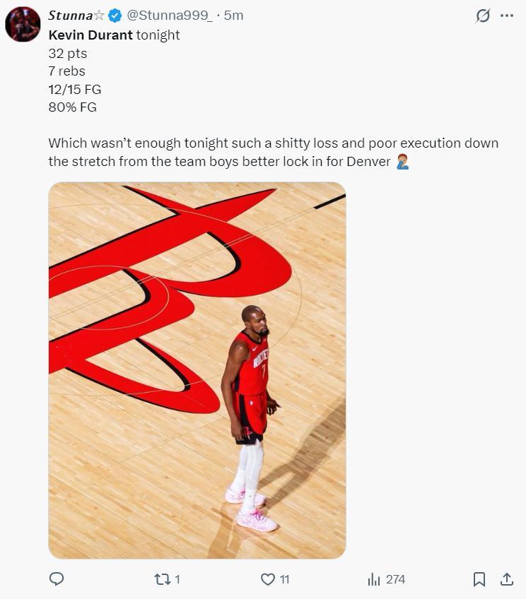 加時賽,杜蘭特向亞當斯要球,亞當斯竟然不給他,杜蘭特非常沮喪,結果阿門、申京、小賈連續的中投打鐵,杜蘭特非常不滿他開始一個球都不傳,從落後4分到只落後1分都是杜蘭特一人之功,只可惜球隊絕平的三分球又沒有給到杜蘭特,鵜鶘只懼怕他一人,兩個人貼着他,最後是謝潑德兩個三分絕平空位沒進,杜蘭特非常落寞。