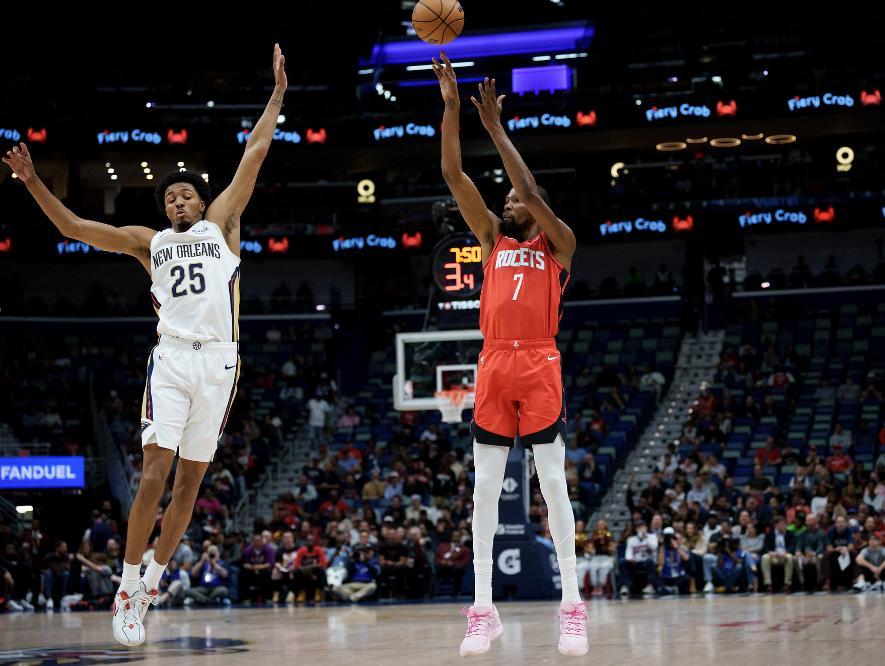 加時賽,史密斯中投命中,鵜鶘前場籃板墨菲補籃,亞當斯竟然不給杜蘭特球,KD繞了一圈只能出去了,阿門中投又鐵,貝三分命中踩線的兩分,火箭是連續的前場籃板二次進攻打鐵,杜蘭特還是沒有獲得出手機會,申京失誤奎因快攻暴扣,杜蘭特持球暴扣續命,貝單打申京命中,杜蘭特被三分犯規三罰全中,普爾兩罰全中,謝潑德兩個三分絕平不中,比賽完結。