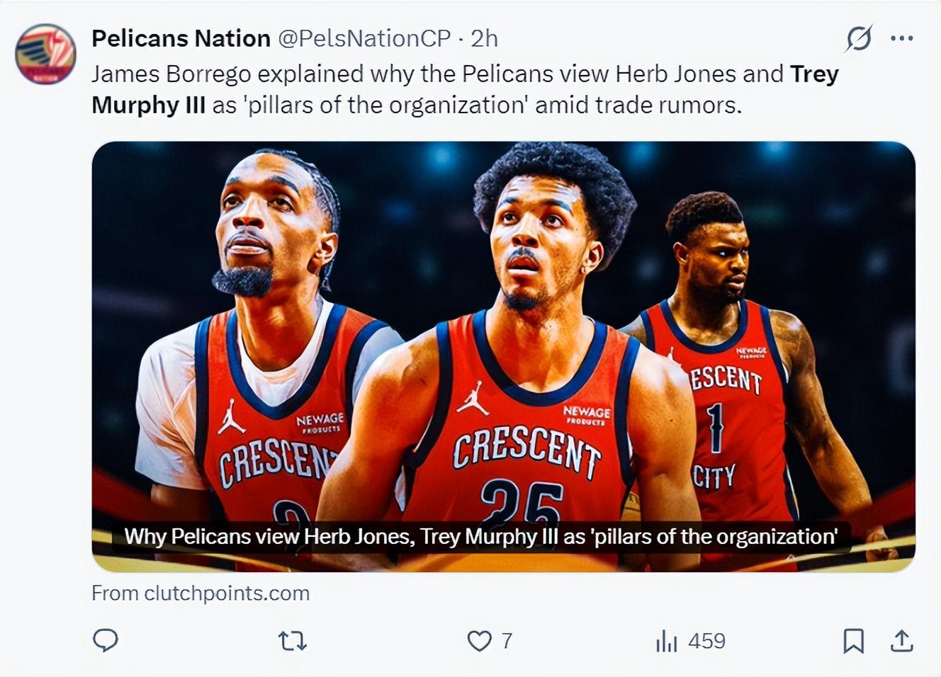 鵜鶘隊的赫伯特-瓊斯、特雷-墨菲、錫安-威廉森目前都已經陷入交易流言中,瓊斯、墨菲兩位鋒線都是頂級正向資產,鵜鶘隊希望從這兩人的交易中收回多個首輪籤,而錫安的交易價值相對低一些,因爲他合同大、傷病隱患大。
