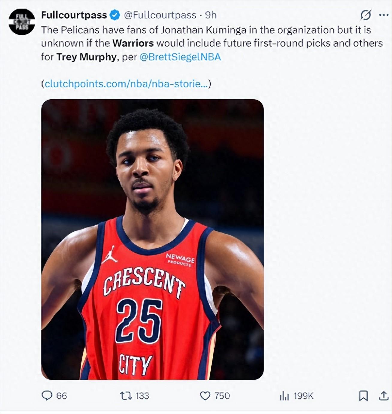 北京時間12月20日,NBA記者BrettSiegel報道,金州勇士隊依舊在密切關注特雷-墨菲的動向,鵜鶘隊內部也有人很喜歡喬納森-庫明加,就是不知道勇士內部是否願意在這筆交易中納入未來的選秀權。