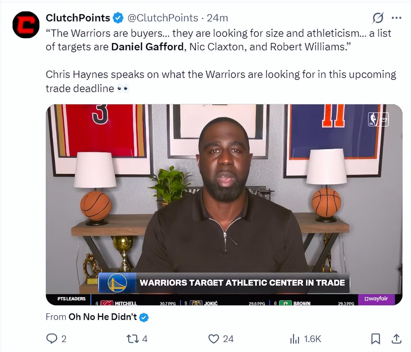 北京時間12月20日中午,《雅虎體育》記者克里斯-海恩斯透露,勇士隊內部正在積極的討論補強內線的計劃,丹尼爾-加福德、尼克-克拉克斯頓、羅伯特-威廉姆斯這樣運動能力出色的中鋒是勇士感興趣的對象。