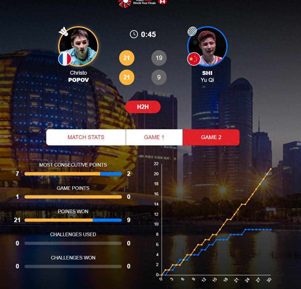第二局開場1-1、2-2、3-3、4-4,小波波夫從6-4開始掌控局勢,石宇奇追到7-8後,小波波夫一波6-1直接14-8拉開到6分,隨後9-14後石宇奇直接崩盤,小波波夫是一波7-0直接拿下勝利,小波波夫21-9輕鬆拿下勝利。