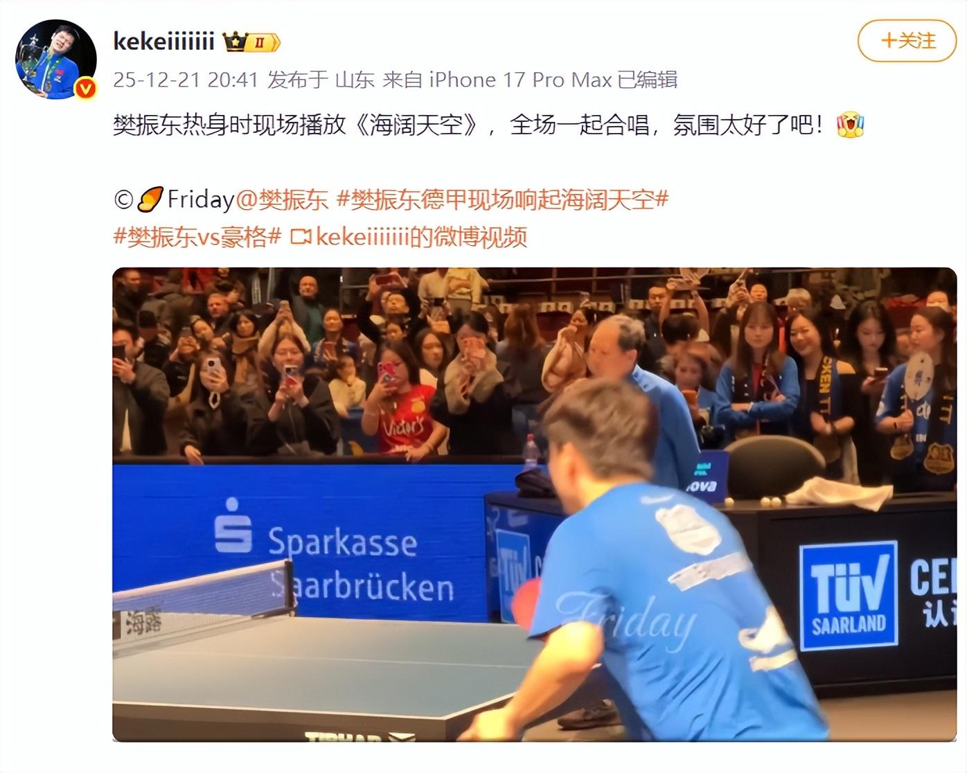 賽前樊振東熱身時主場爲他響起了他最喜愛的粵語歌《海闊天空》,最關鍵的是全場球迷一起大合唱,這就是樊振東的國際影響力。