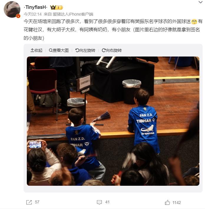 一位薩爾布呂肯當地的球迷寫道,看到了很多穿着印有樊振東名字球衣的外國球迷,有花臂壯漢、大鬍子大叔、老奶奶、老阿姨、小朋友。