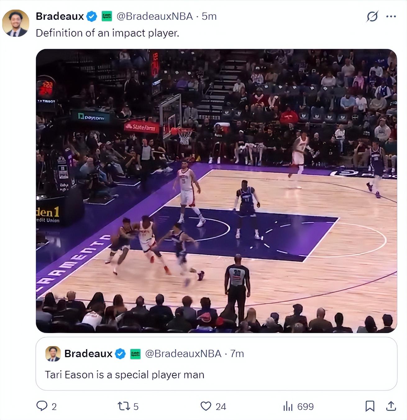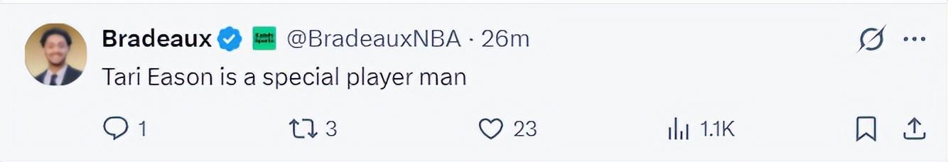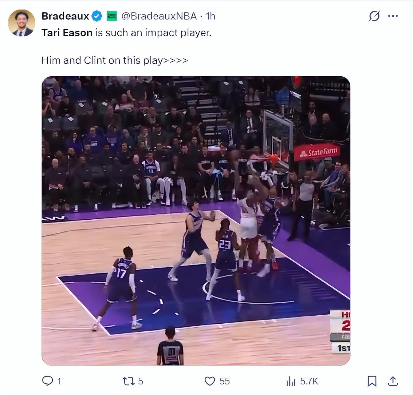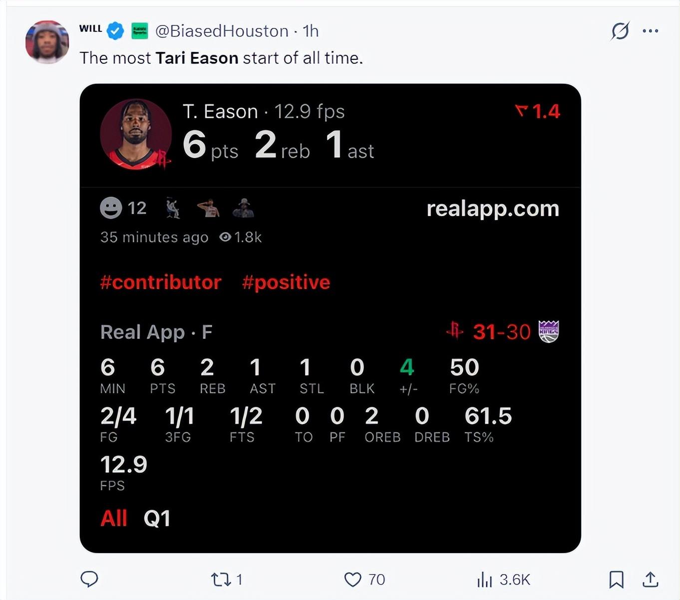 火箭記者Bradeaux寫道:伊森三節比賽拿到16分3籃板3助攻,真實命中率高達90.1%,他只打了15分鐘而已。