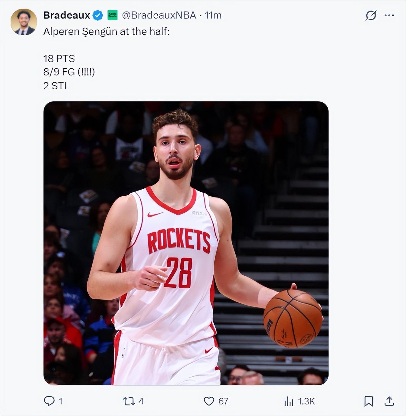 上半場打完申京17分鐘,9中8,拿到18分2籃板2搶斷1蓋帽,命中率88.9%,申京就是火箭上半場領先國王兩位數的關鍵。