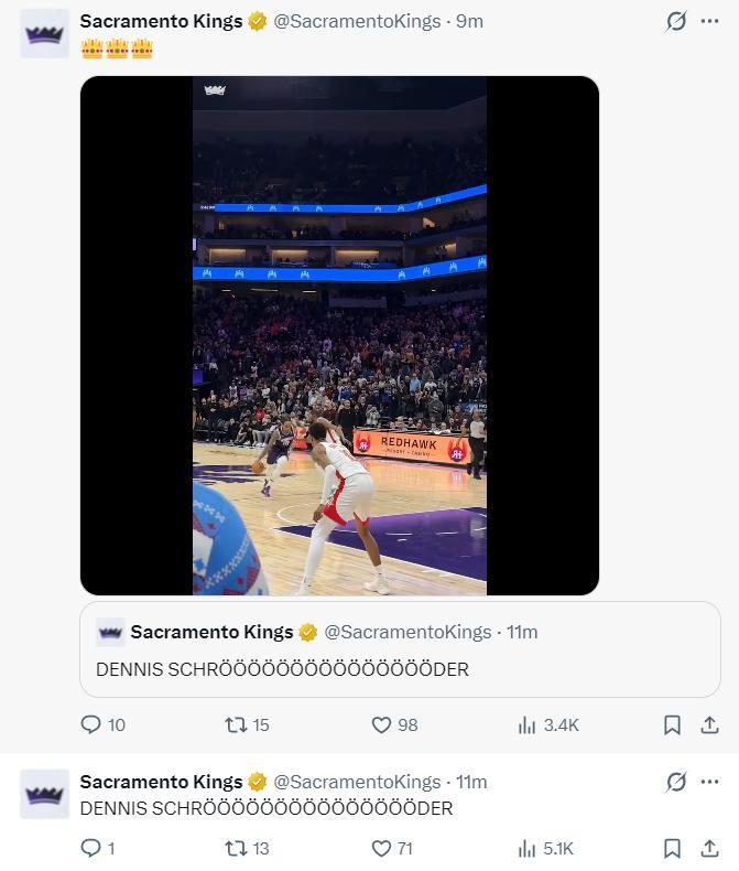 國王官方又爲施羅德歡呼,還曬出施羅德三分準絕殺的視頻爲黑總戴上皇冠。