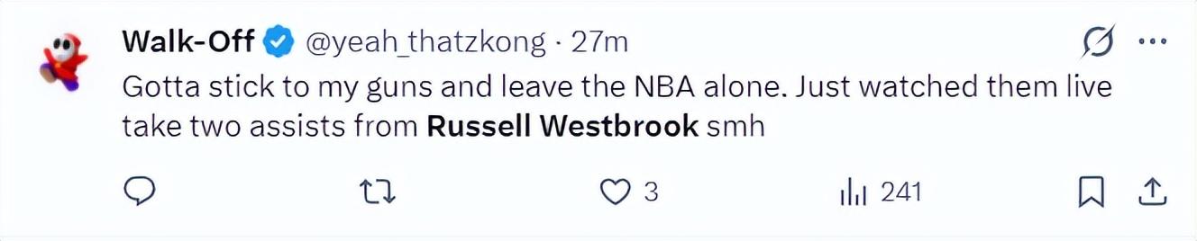 第二節威少再度命中一個三分球,可他連續送出了兩個助攻,可上半場結束後威少僅1個助攻,國王媒體:NBA官方又把威少的數據給刪除了,那你們爲什麼還保留一個助攻呢?笑死我了。