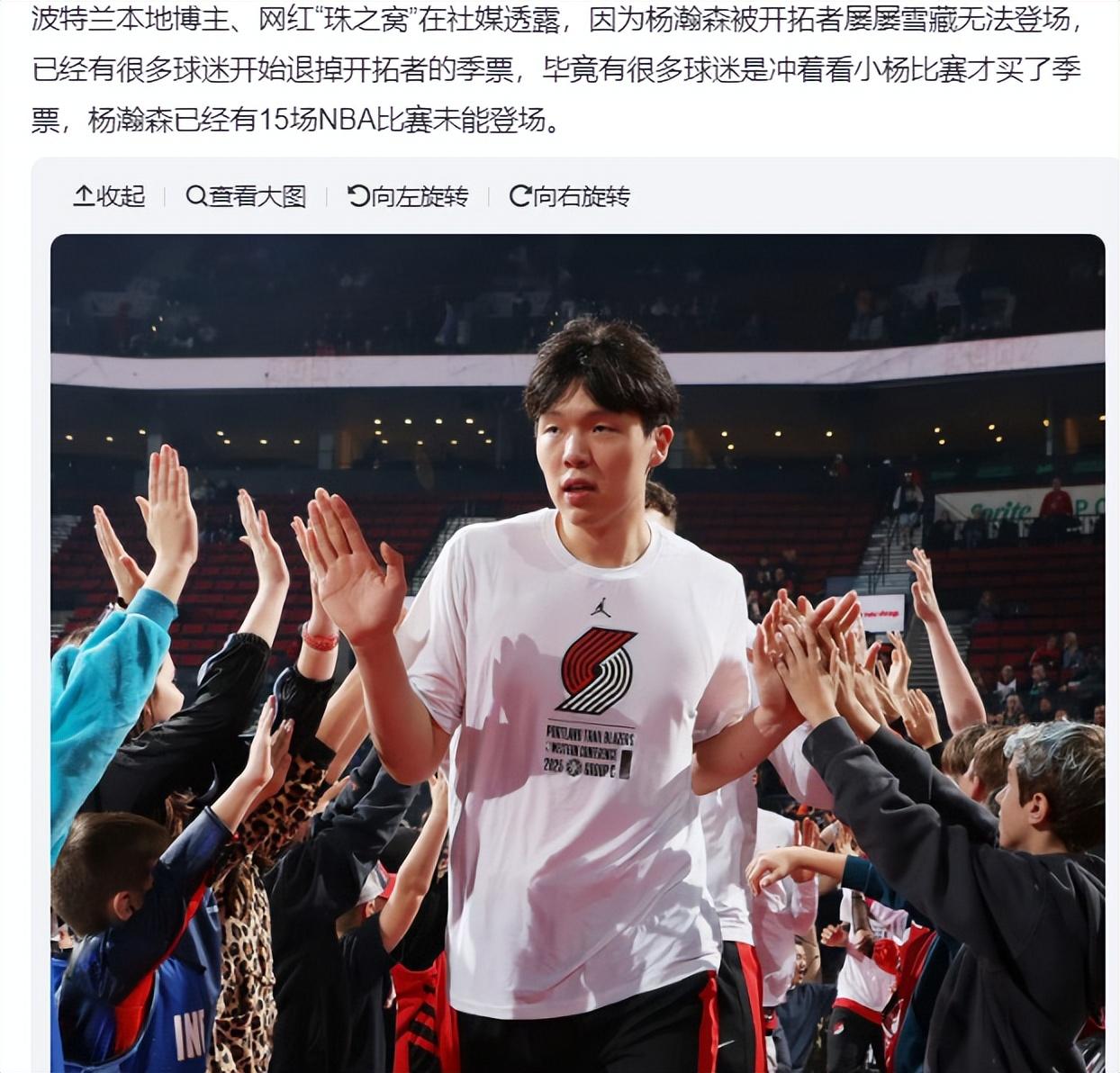 一天之前,根據波特蘭當地的博主透露,因爲楊瀚森被開拓者雪藏無法登場,很多球迷已經開始退掉開拓者主場的季票,大多數手持季票的球迷都是想看楊瀚森打球。