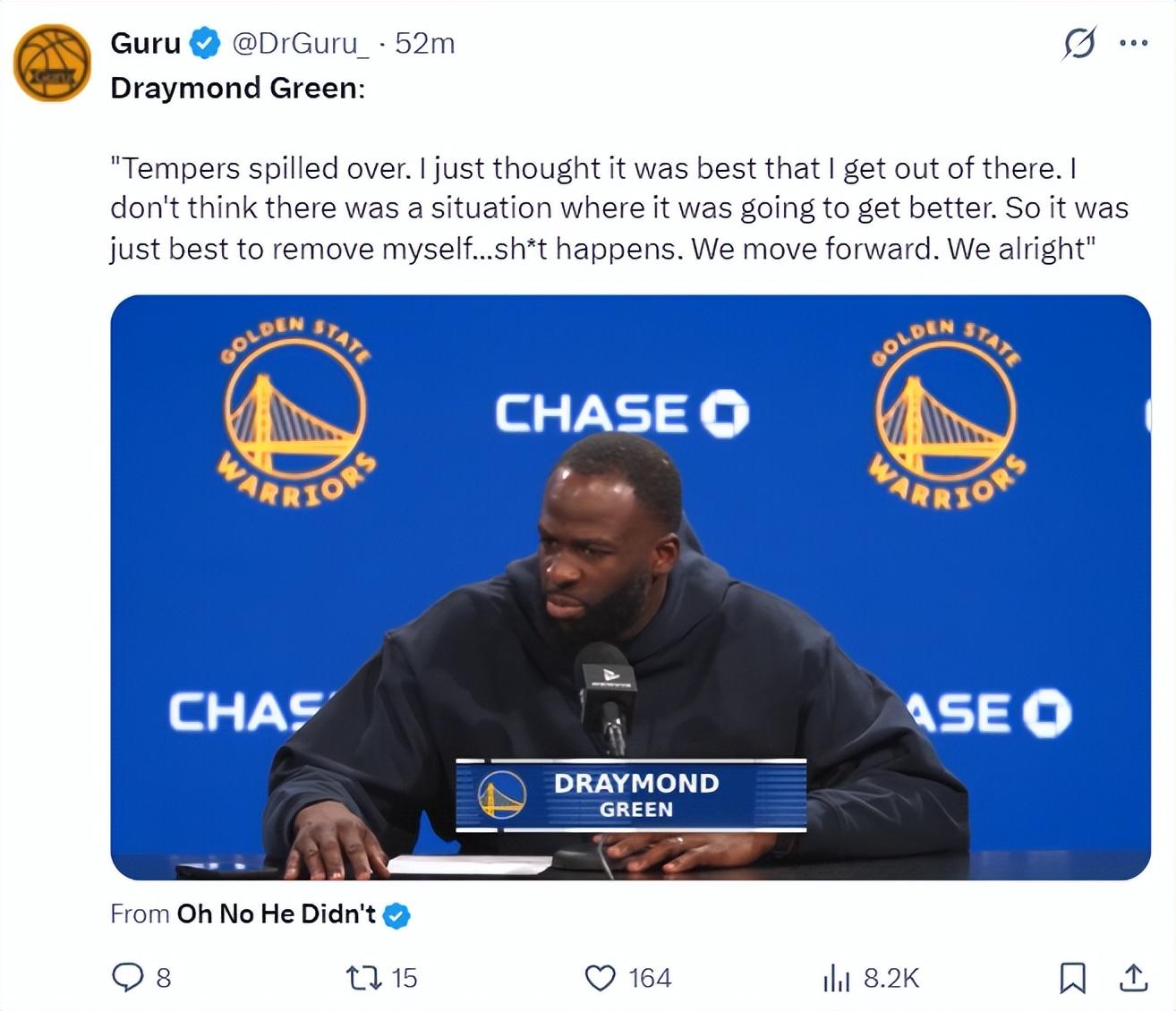 我們喜歡看到德雷蒙德與庫裏一同打球,他們二人的配合感覺很好,我希望格林能打得自信,不要擔心失誤就畏首畏尾,我們都需要找到平衡點,每個人都需要做出一些犧牲,一些取捨。