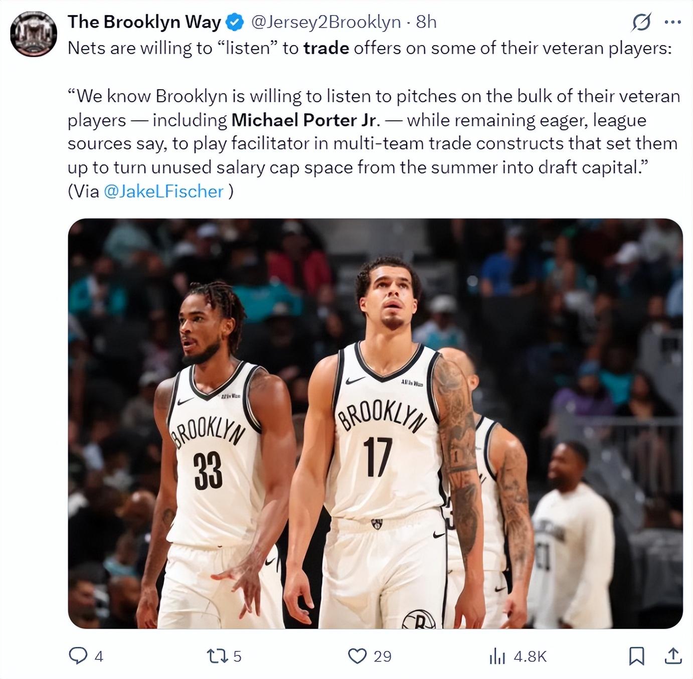 根據《露天看臺》記者傑克-費舍爾的報道,籃網已經將小波特擺上貨架,希望用他換取未來資產、首輪選秀權。籃網是真怕小波特繼續打讓他們首輪籤的順位持續下滑,他打得太好影響球隊擺爛。