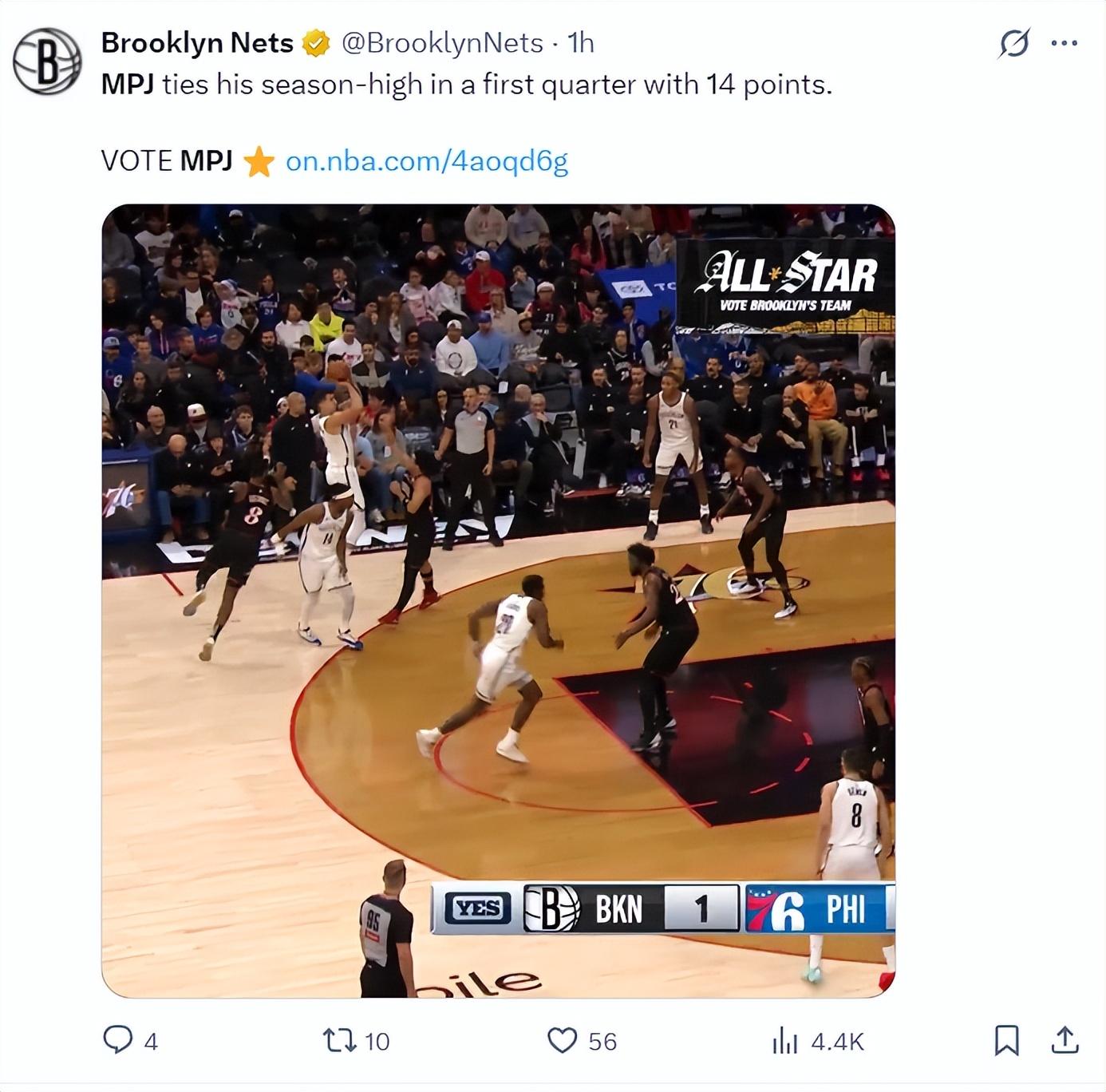 小波特的3+1命中後籃網媒體再一次盛讚他就是KD附體。第三節費城已經開始包夾小波特了,這一節他4中1+三分2中0效率下來了,三節27分鐘拿到27分。