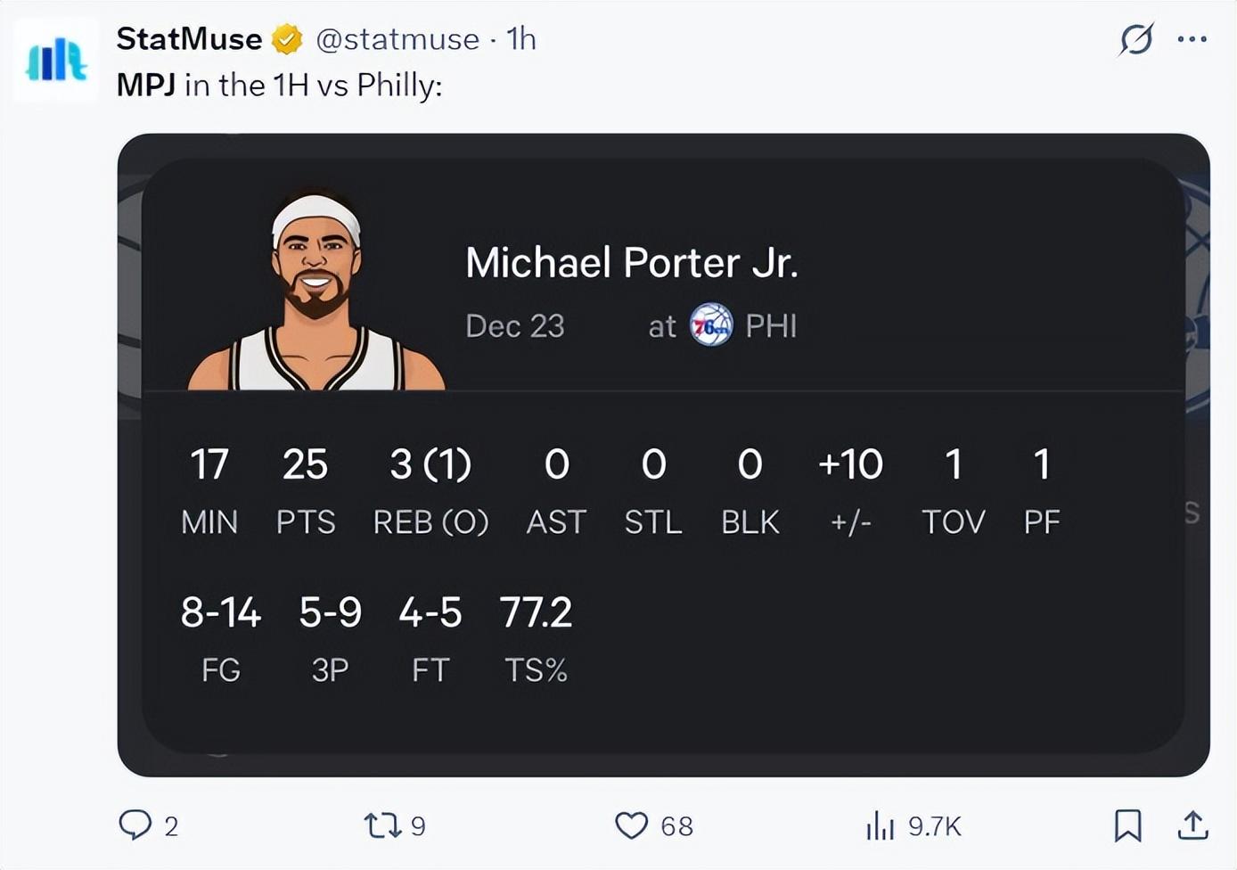 上半場17分鐘,14中8,三分9中5,罰球5中4,拿到25分3籃板,真實命中率高達77.2%,他幫助籃網拉開到10分以上的差距,喬治面對他是真的防不了,2.01米的喬治老胳膊老腿,他面對2.08米的小波特什麼都不佔優。