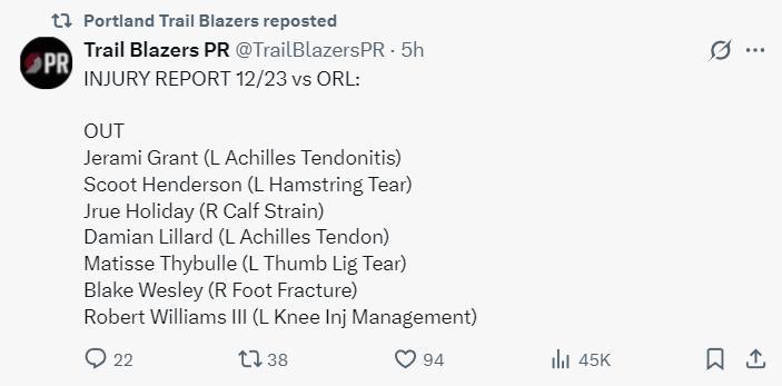格蘭特(左跟腱炎)、亨德森(左腿肌肉撕裂)、霍勒迪(右小腿拉傷)、利拉德(左跟腱)、塞布爾(左拇指韌帶撕裂)韋斯利(右腳骨折)、羅威(左膝蓋傷勢管理)都傷缺。
