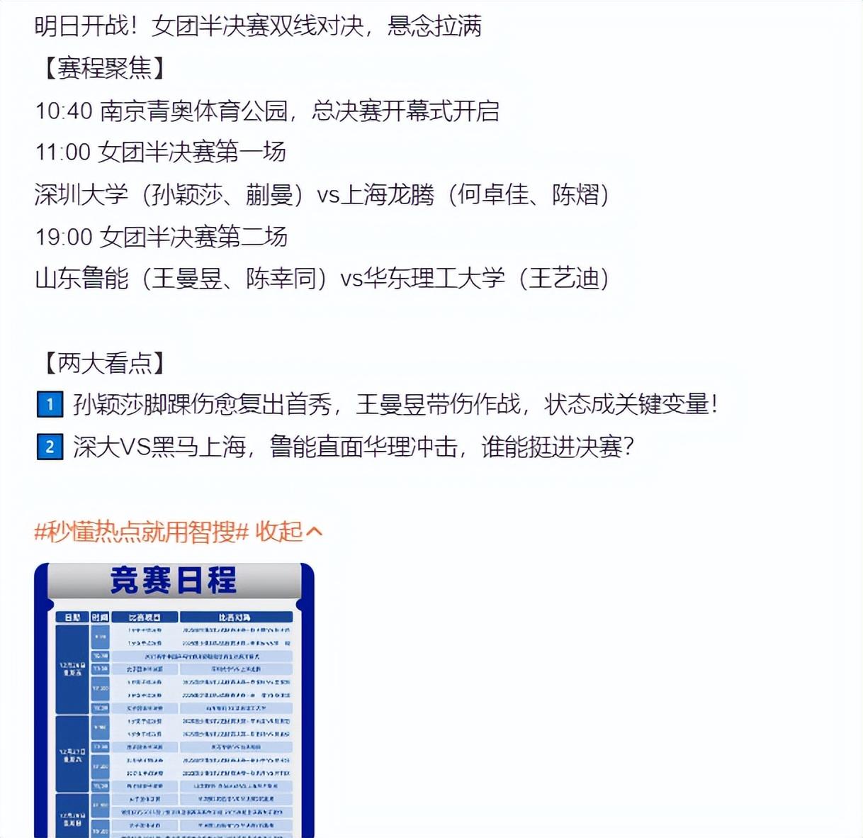 12月26日在南京青奧體育館就要打響總決賽,11點女團半決賽第一場:深圳大學VS上海龍騰。(目前孫穎莎、王楚欽、王曼昱三人都沒有確定出戰,因爲這三人都有傷在身)