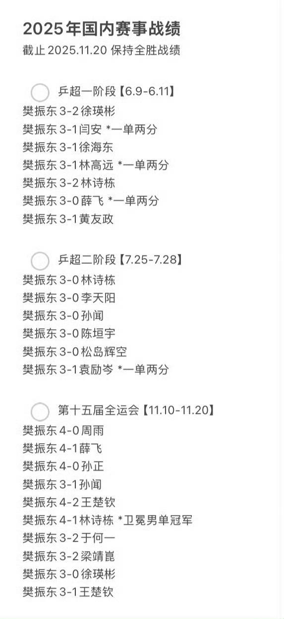 而且樊振東在整個2025賽季國內賽事是保持不敗的: