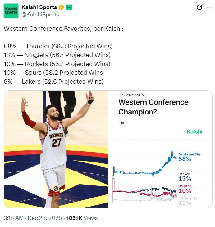 火箭拿到西部冠軍的概率已經跌至10%,馬刺已經跟火箭持平,一週多之前火箭還是僅次於雷霆的存在。