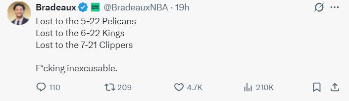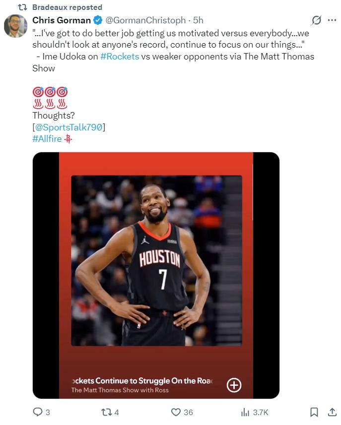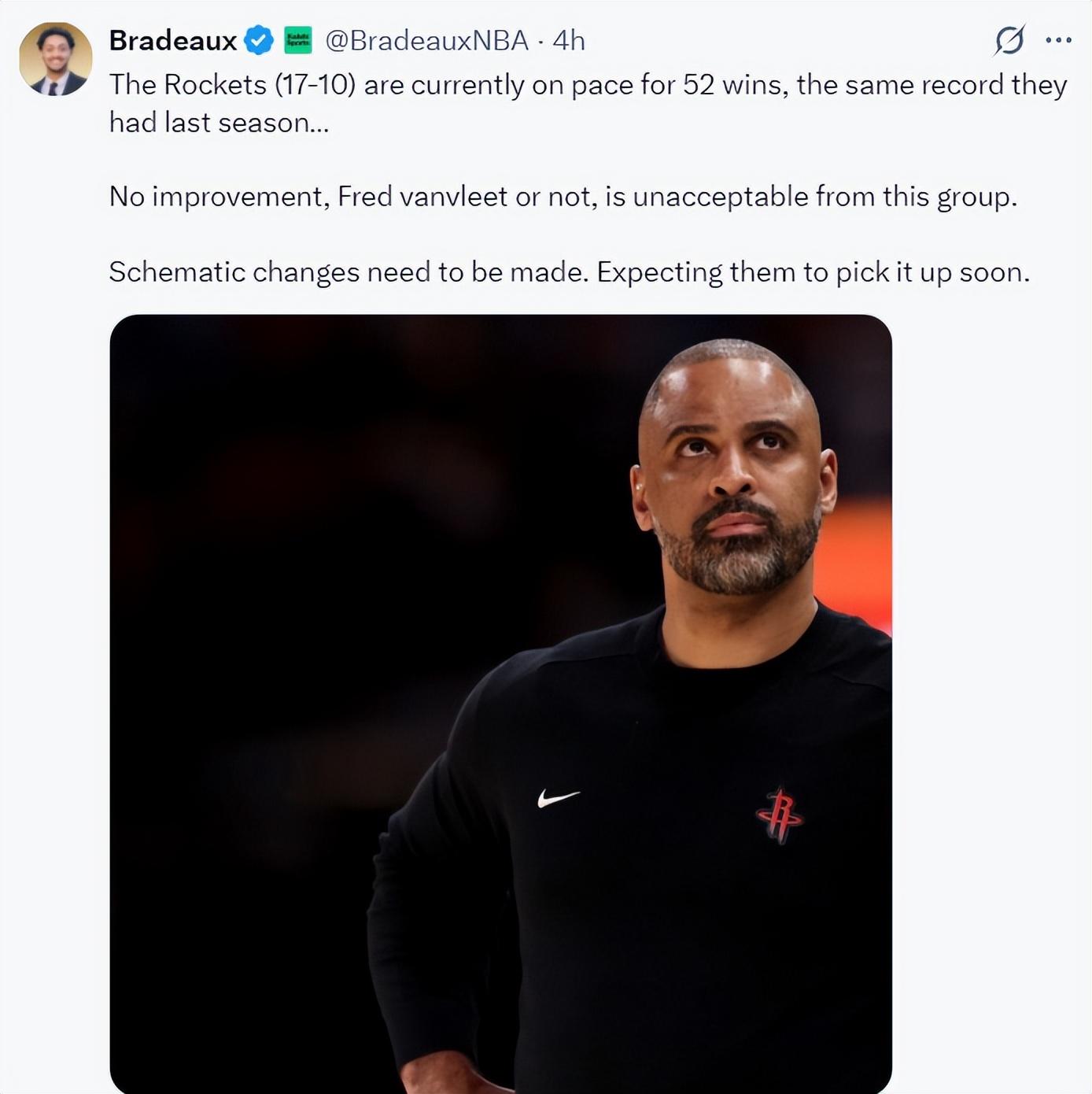 火箭記者Bradeaux寫道:火箭目前17勝10負,目前戰績預測顯示他們有可能拿到52勝,這與火箭上賽季的戰績持平,不管有沒有範弗利特這支球隊在增加了KD的情況下戰績沒有任何進步是不可接受的,球隊需要找到一些改善的辦法。