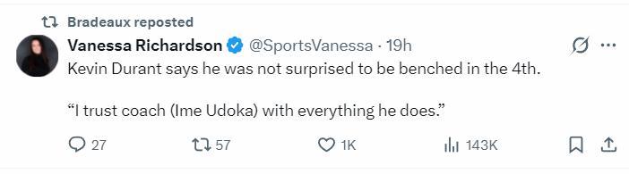杜蘭特談到自己在對陣快船第四節被DNP,他表示:我對此並不感到意外,我對教練組的一切舉措都完全信任,包括烏度卡做的每一件事我們都無條件信任。