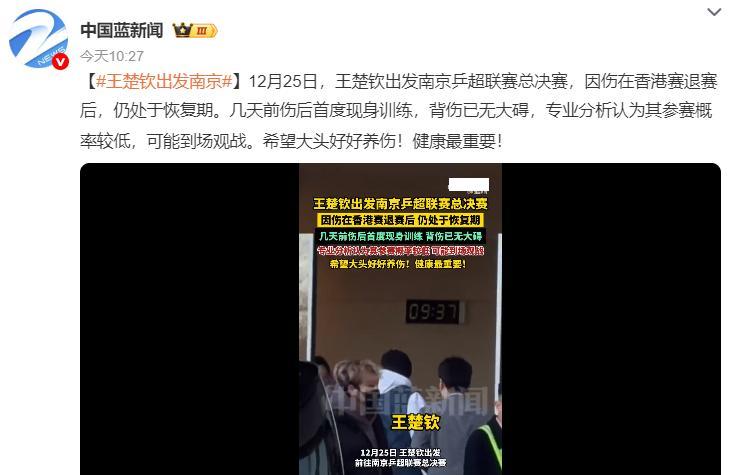 根據浙江媒體《中國藍新聞》的報道,王楚欽出發南京乒超總決賽,因爲王楚欽在香港總決賽因傷退賽,他還在恢復期。幾天前王楚欽曾現身訓練,背傷已經沒有大礙,但專業分析認爲王楚欽參賽的概率較低,大概率是在場邊觀戰。