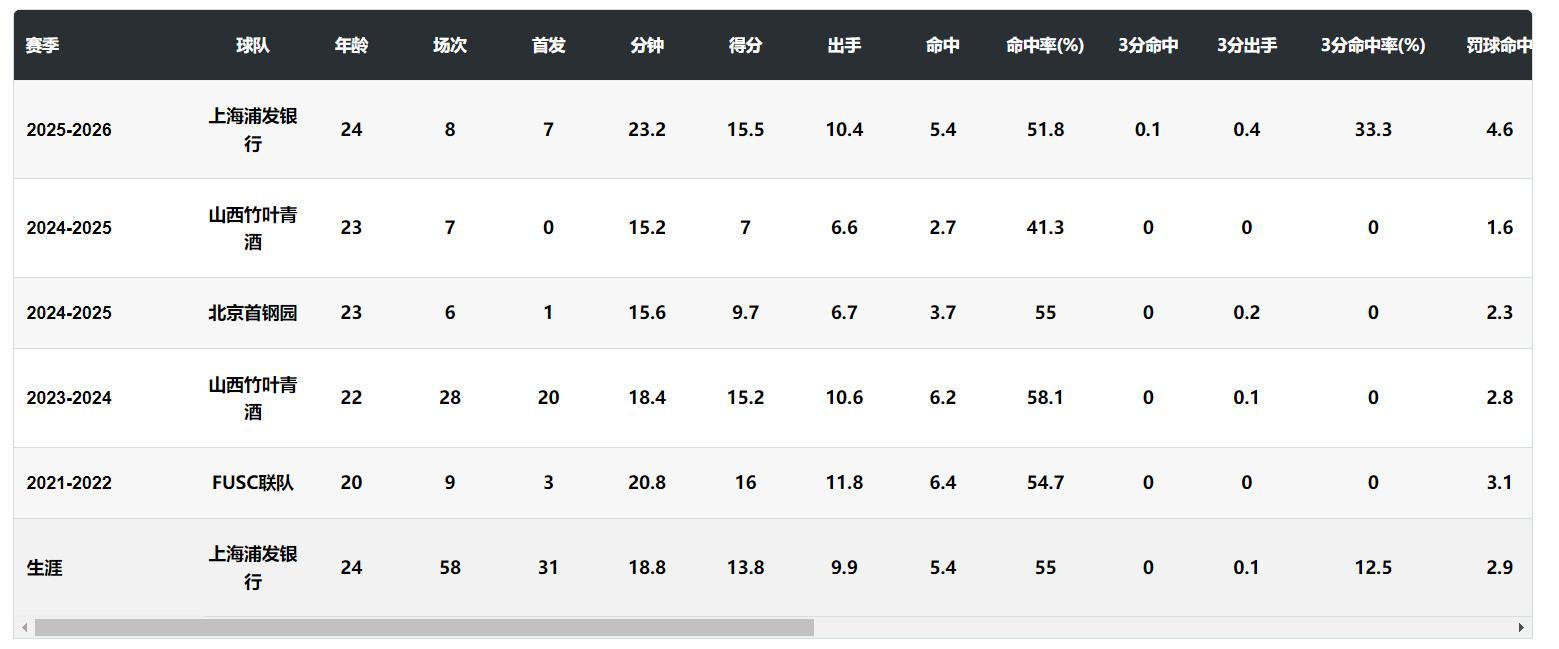 本賽季上海的9場比賽她出戰了8場其中7場先發,場均23分鐘,拿到15.5分5.1籃板1.1助攻0.8搶斷0.1蓋帽,命中率51.8%,三分命中率33.3%,她目前已經坐穩了上海女籃先發的席位,目前上海隊4勝5負排在聯盟第六不算差。