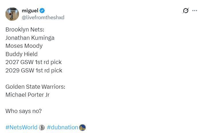 美媒Miguel爲籃網、勇士設想了一筆交易方案: