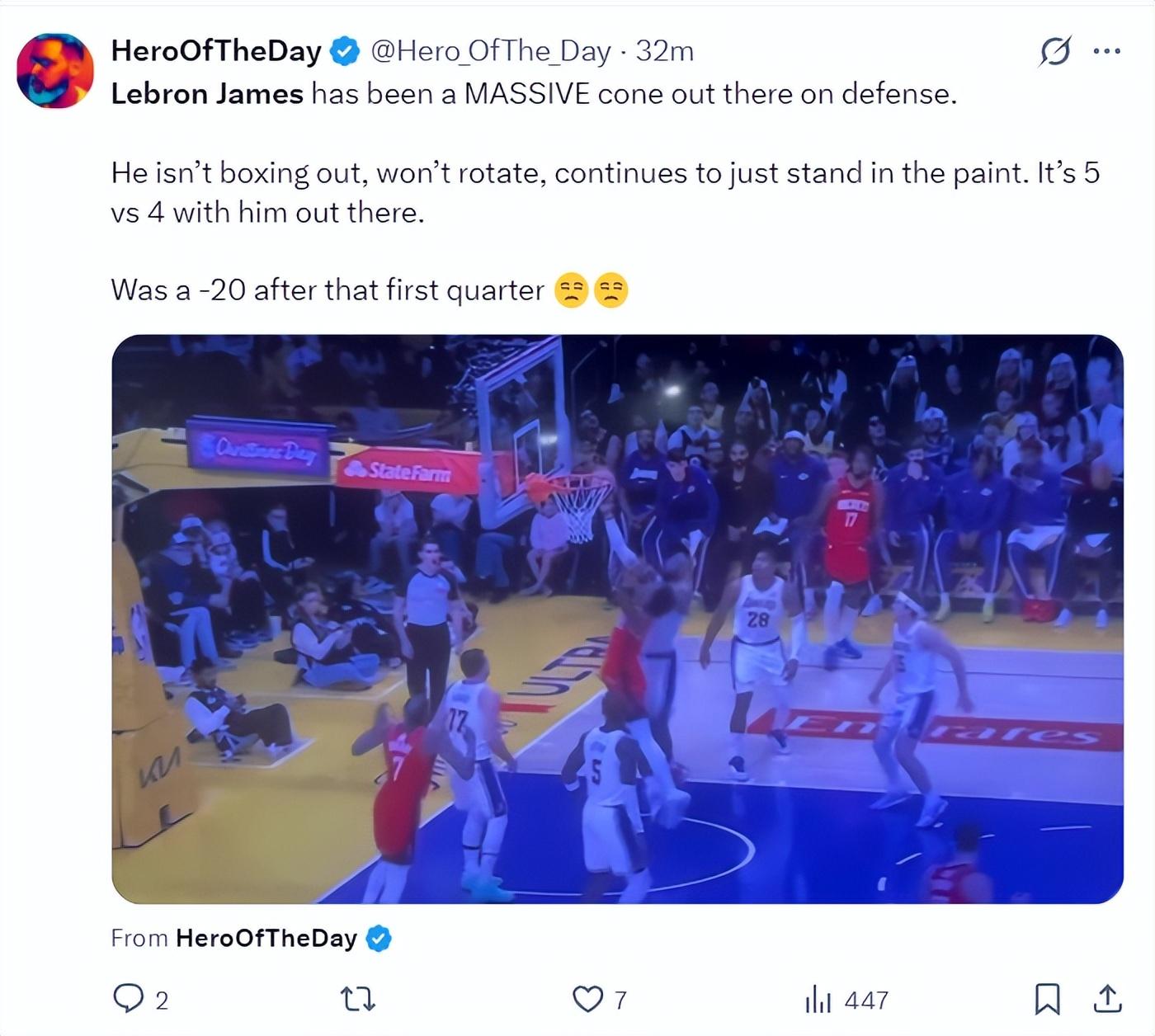 詹姆斯在上半場被噴慘了,美媒HOT:詹姆斯在防守端是巨大的漏洞,他不卡位、不輪轉協防、就一直站在籃下,他在場總是出現5打4的情況,詹姆斯上半場打完正負值接近-20(實際上-16)。上半場老詹18分鐘,4中2拿到8分4助攻2籃板2搶斷。