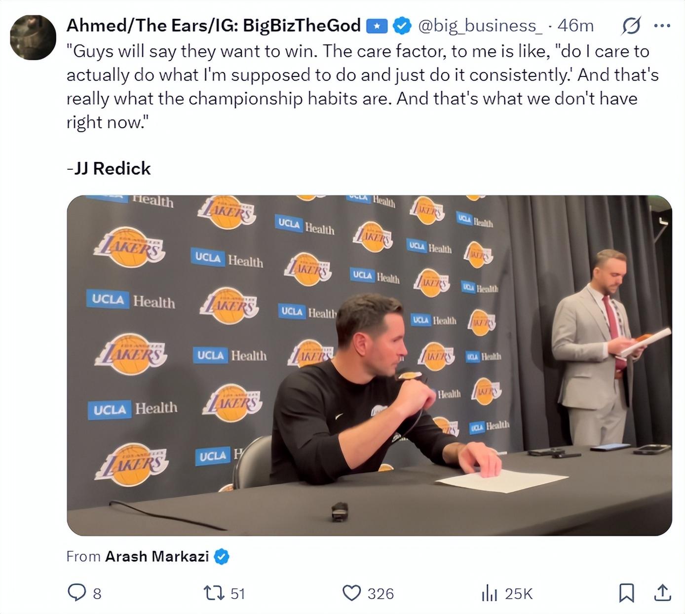 賽後雷迪克對湖人全隊的表現特別的不滿,他透露在湖人輸給太陽後剛剛纔進行了一場令人不太舒服的覆盤/錄像分析,以解決球員在場上漫不經心、不退防、不輪轉等問題,但這場比賽湖人全隊依舊跟覆盤之前一樣。