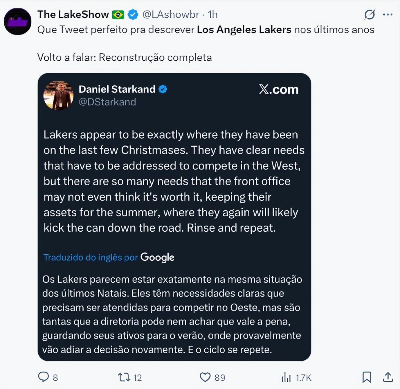 湖人記者Daniel StarKand在一年之前的年終大戰前就說過湖人早該全面重建,一年後他再次提到湖人該全面重建:湖人的問題似乎跟去年年終大戰前一模一樣,他們有明確的需求想在西部競爭,但管理層認爲補強競爭有些不值得,他們還是想留資產到夏天,以此循環往復,都沒有任何的實質性改變。