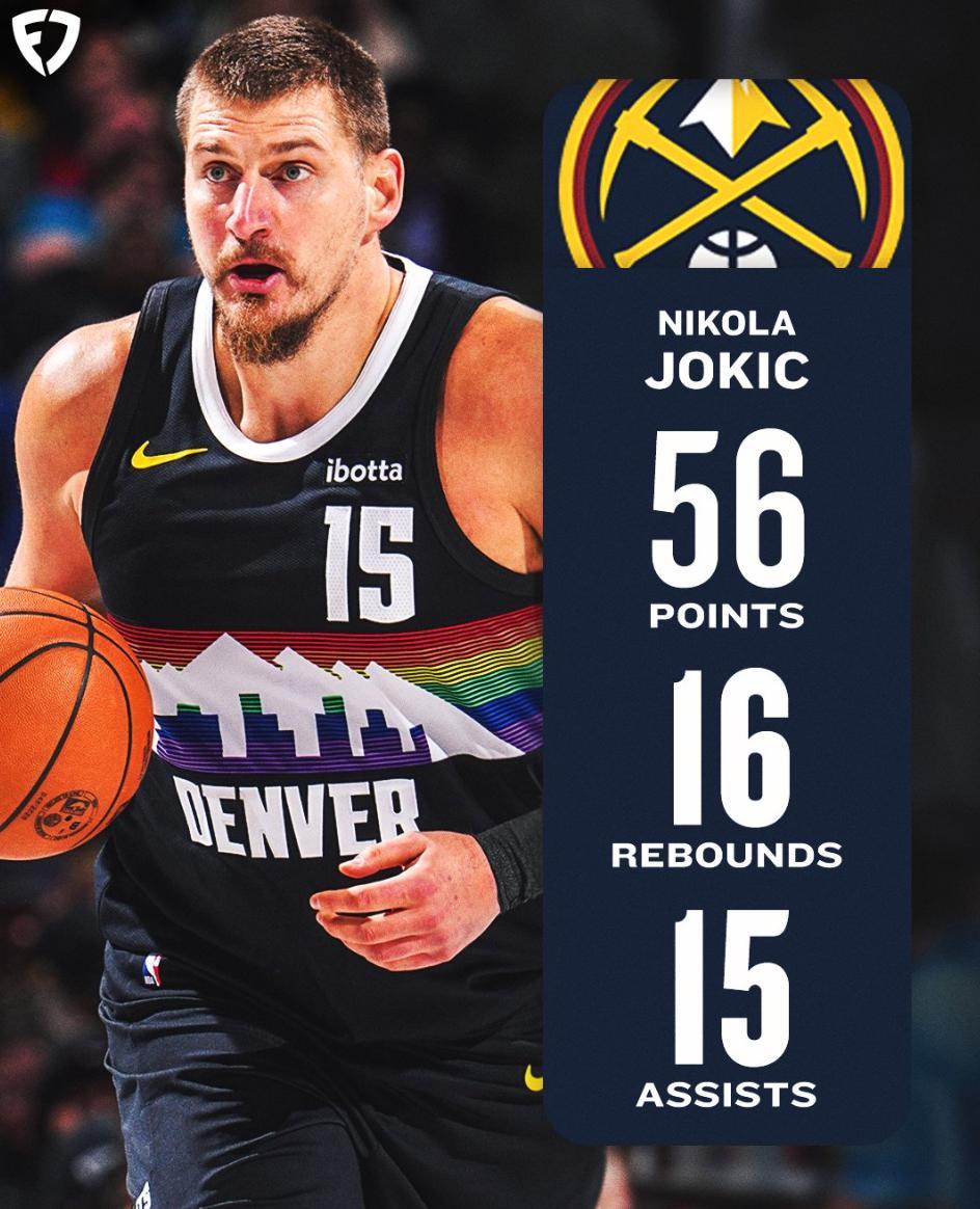全場比賽,約基奇43分鐘,21中15,三分6中4,罰球23中22,拿到56分16籃板15助攻2蓋帽,命中率71.4%,三分命中率66.7%,真實命中率90%。