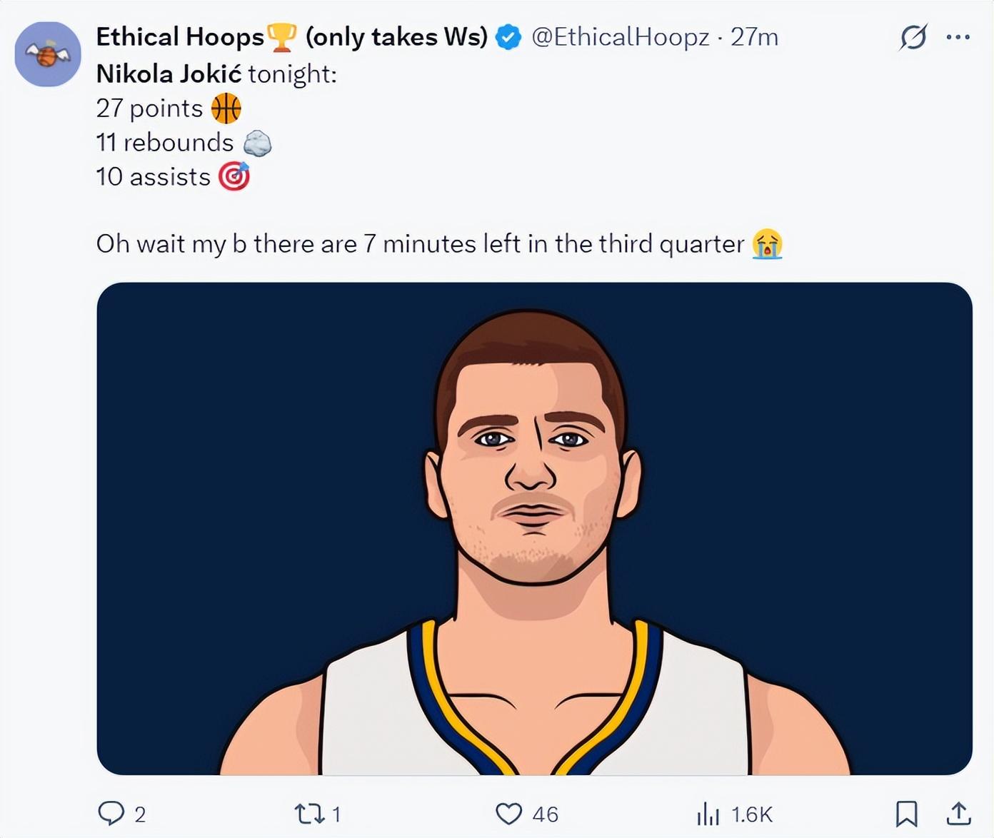 第三節還剩7分鐘約基奇已經達成27分11籃板10助攻,1.他完成職業生涯第73次三節三雙繼續刷新歷史第一紀錄。