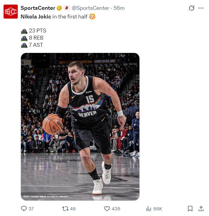 第二節約基奇6分多鐘2中2拿到5分3籃板3助攻,半場約基奇已經拿到23分8籃板7助攻,愛德華茲的表現完全無法跟約基奇相比,兩人不是一個層級的運動員。