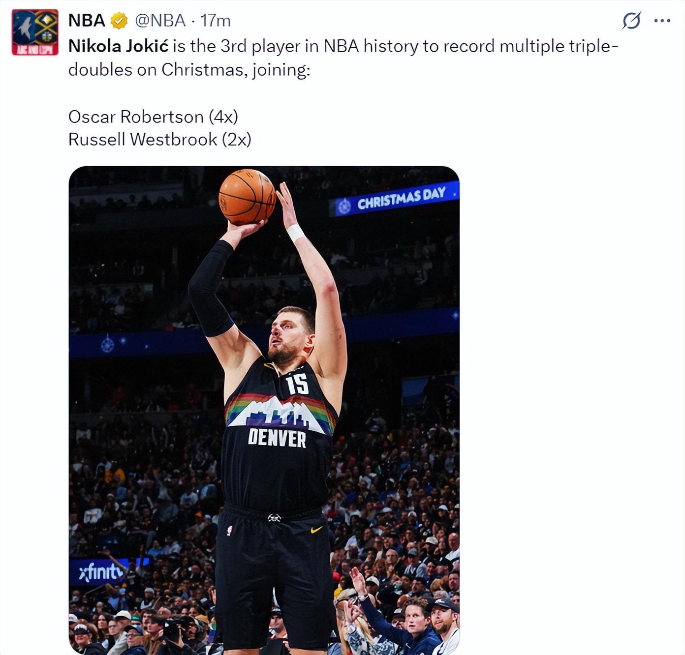 第三節約基奇3中2+三分2中1+罰球4中4拿到9分6助攻5籃板,三節打完已經拿到32分14籃板13助攻的恐怖大號三雙,2.他已經成爲NBA歷史第三位多次在年終大戰拿到三雙的球員,比肩大O4次、威少2次、約基奇2次。
