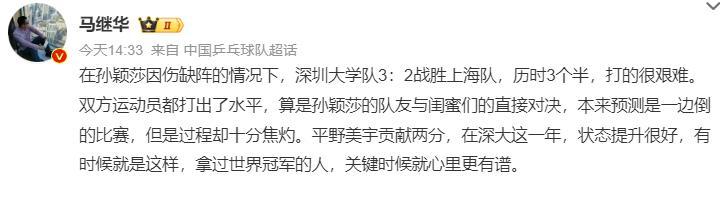 賽後乒乓球專家馬繼華點評:在孫穎莎缺席的情況下,深大3-2上海隊。平野美宇貢獻兩分她在深大這一年狀態提升很好,拿過世界冠軍的人冠軍時刻心裏有譜。