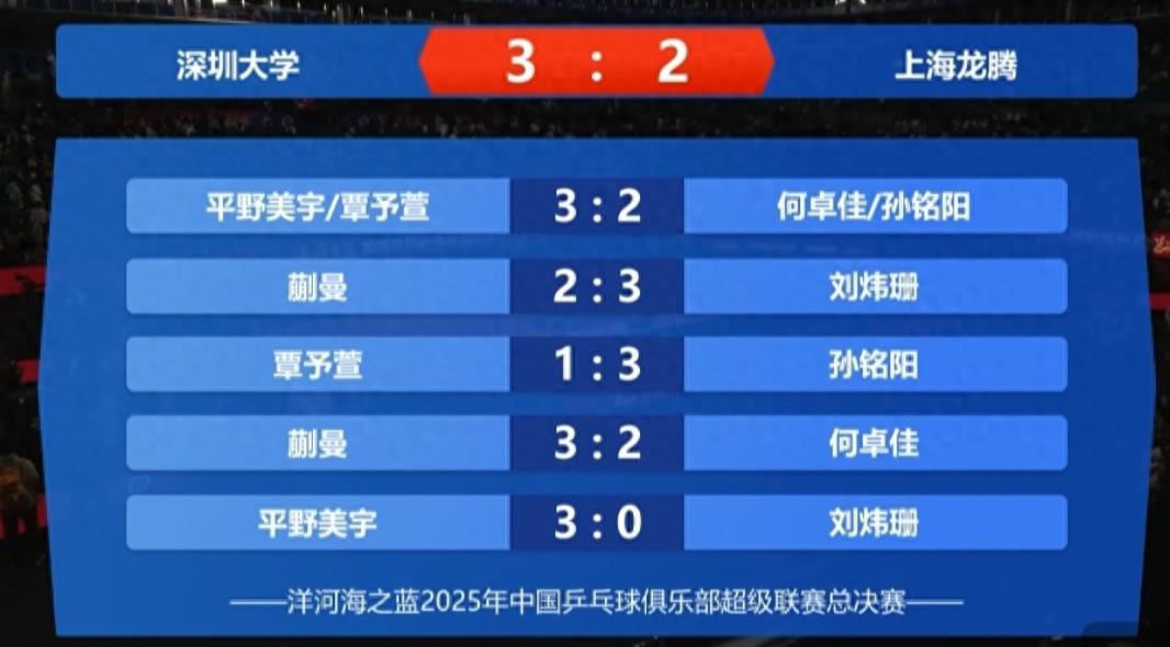 北京時間12月26日,2025年乒超總決賽女團半決賽,深圳大學3-2擊敗上海龍騰,這場比賽作爲國乒主力的蒯曼是1勝1負,外協的平野美宇卻幫助深大拿到2分,平野美宇成爲此役深大的超級功臣。