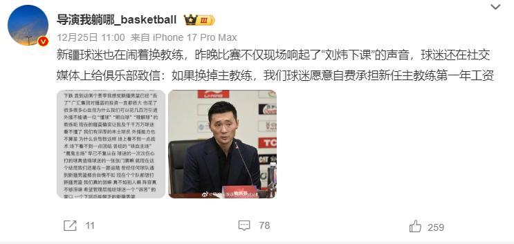 新疆主場不敵青島後,很多球迷都在高呼劉煒下課,甚至有球迷給俱樂部寫信解僱劉煒,球迷願意承擔劉煒一年的薪水。青島客場VS新疆的21連敗被終結。