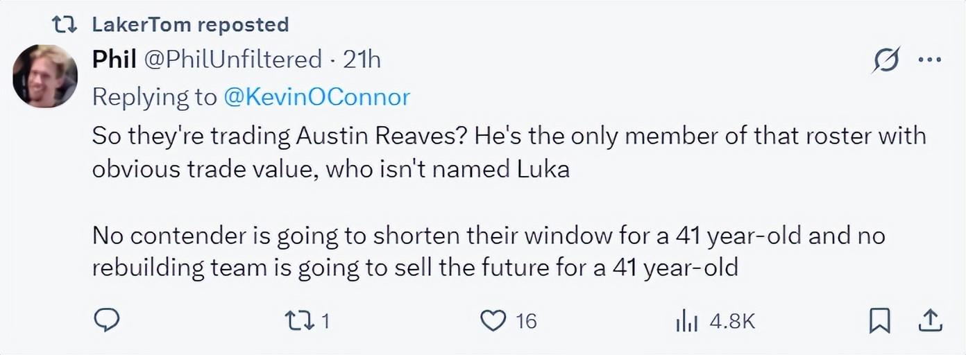 凱文-奧康納在播客中說道,湖人的非賣品實際上只有東契奇,41歲的詹姆斯沒有任何交易價值,湖人也不是圍繞41歲的勒布朗建隊,所以湖人要真的改善陣容只能交易奧斯汀-裏夫斯。