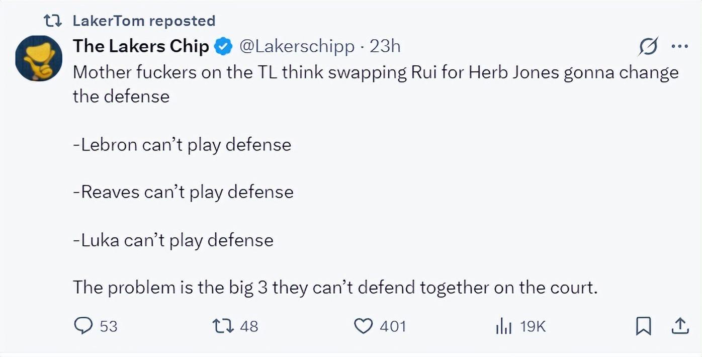 當詹姆斯、裏夫斯、東契奇三個核心都不能防守時,難道就交易得到一個3D側翼就能完全改變球隊體系嗎?明顯是癡人說夢。