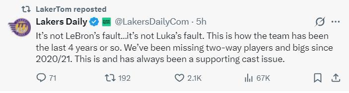 北京時間12月27日晨,湖媒Lakers Daily發聲:這不是詹姆斯的錯也不是東契奇的錯,過去四年湖人一直都是這個樣子,從20-21賽季開始我們就缺少攻防雙向球員與中鋒,替補陣容的問題尤爲明顯。