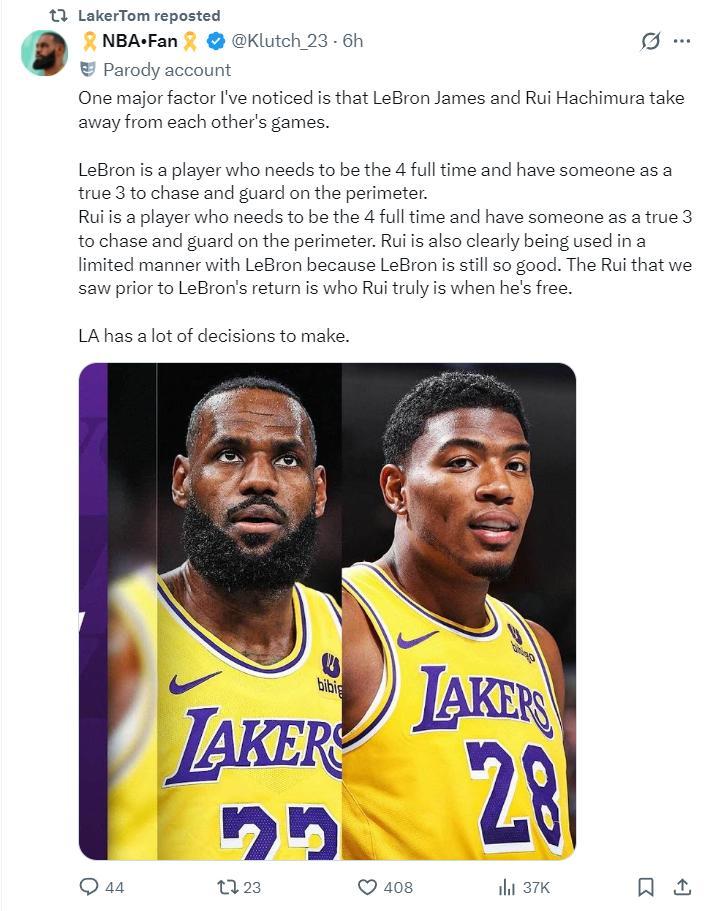 湖媒NBA-Fan還拋出一個論點:詹姆斯與八村壘同時上場會相互制約,但球隊沒有任何改變。詹姆斯需要長期打四號位,八村壘同樣需要長期打四號位,這兩人都需要一位真正的三號位幫助他們拉開空間/防守,詹姆斯復出後嚴重製約八村的發揮,因爲41歲的勒布朗依舊出色,可八村壘也是無法防三號位的PF。