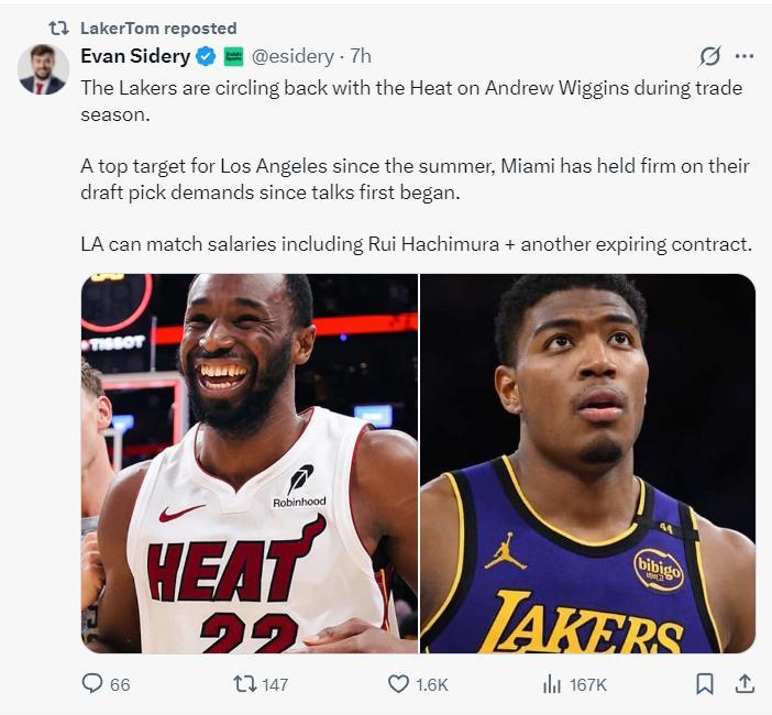 根據NBA記者埃文-斯迪瑞寫道:湖人隊已經重啓了跟熱火隊的談判,湖人依舊想要得到安德魯-威金斯。自今夏開始,湖人一直都在努力的交易得到維金斯,但邁阿密一直要求得到未來選秀權與年輕資產,湖人希望用八村壘+添頭去換威金斯,這使得交易陷入僵局。