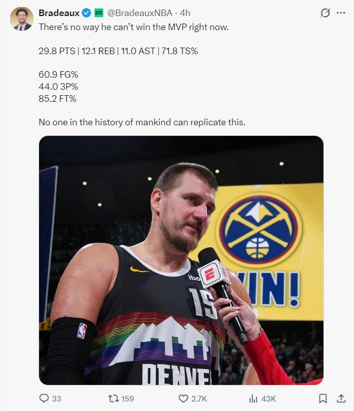 火箭記者Bradeaux曬出約基奇場均29.8分12.1籃板11助攻,真實命中率71.8%的數據寫道:他不拿常規賽MVP天理難容。