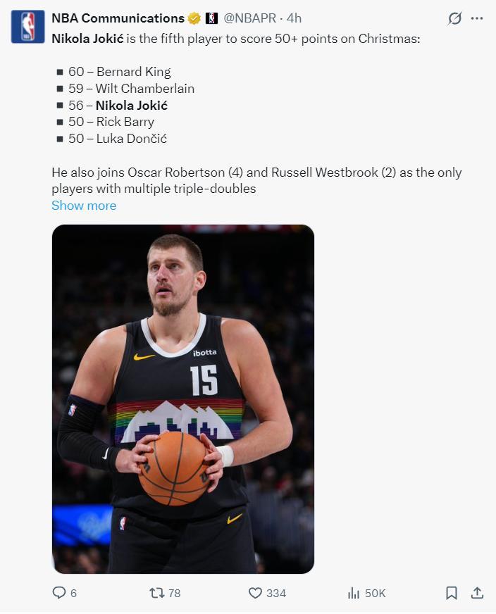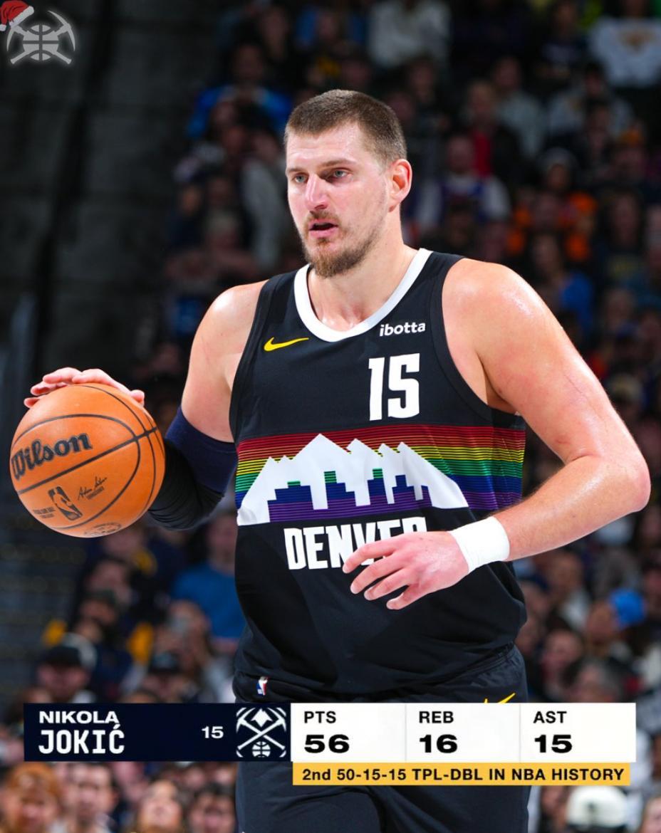 此役約基奇一戰創造太多的紀錄:1.聖誕大戰56分歷史第三高;