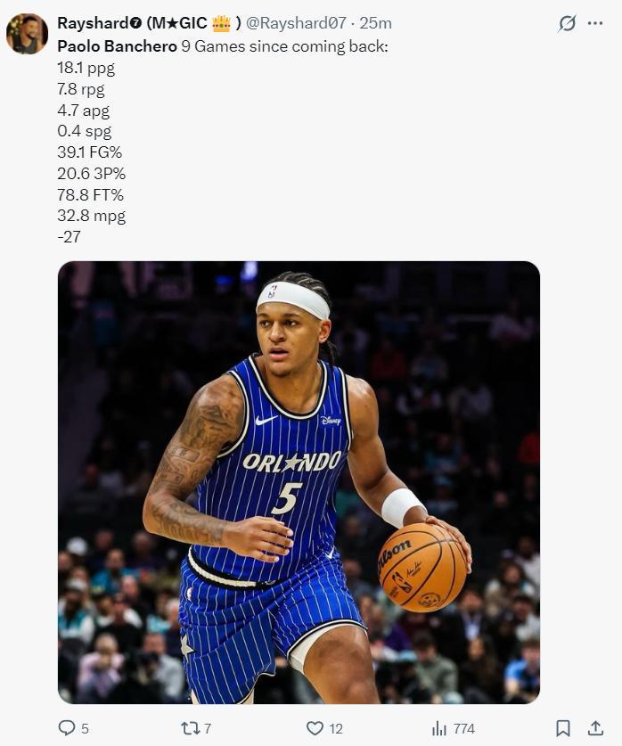 小瓦格納傷停後的八場比賽輸掉了其中5場,班凱羅獨自帶隊與小瓦獨自帶隊階段的表現判若兩人,小瓦格納經歷了歐錦賽後漲球很猛烈,而班凱羅則不增反降,他這五年2.4億的頂薪明夏就要生效了,魔術又輸麻了,班凱羅要被安上水貨狀元的標籤了。