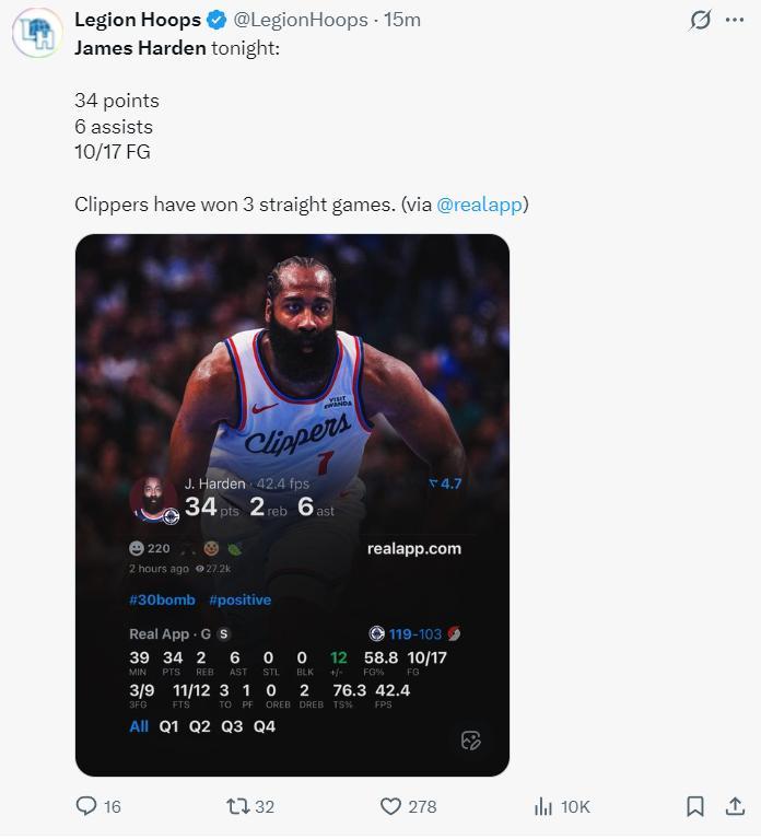 進入最後3分04秒,哈登突破命中、三分命中、兩罰命中,換言之是連拿7分幫助快船鎖定勝局,末節哈登4中3+三分2中1+罰球4中4拿到11分1籃板1助攻,這個表現真的太出色了。