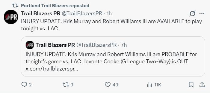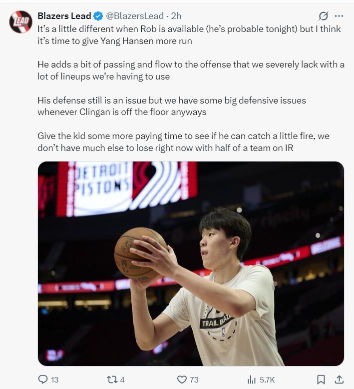 拓媒:我認爲開拓者應該給楊瀚森更多的登場時間。(但這場比賽楊瀚森並沒有獲得任何的登場時間)