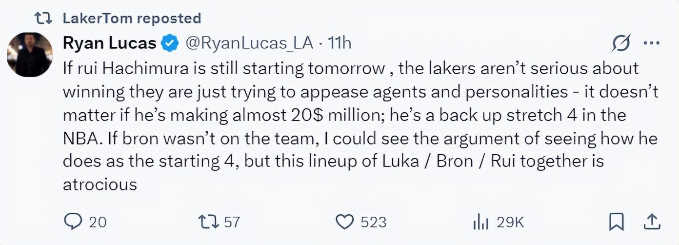 北京時間12月28日,湖人記者瑞安-盧卡斯明確表示,如果湖人還是用八村壘打先發那麼他們就不是真的想贏下比賽,他們只是在試圖安撫經紀人與一些球員,八村壘雖然接近2000萬的年薪但他的實力只能是NBA替補,如果詹姆斯不在隊內湖人不可能給他先發,他搭檔詹姆斯、東契奇的先發太糟糕了。
