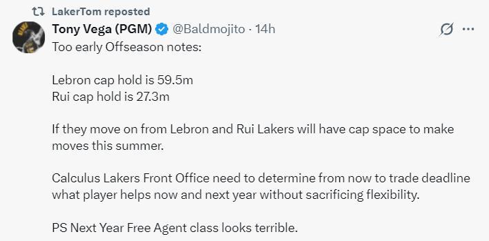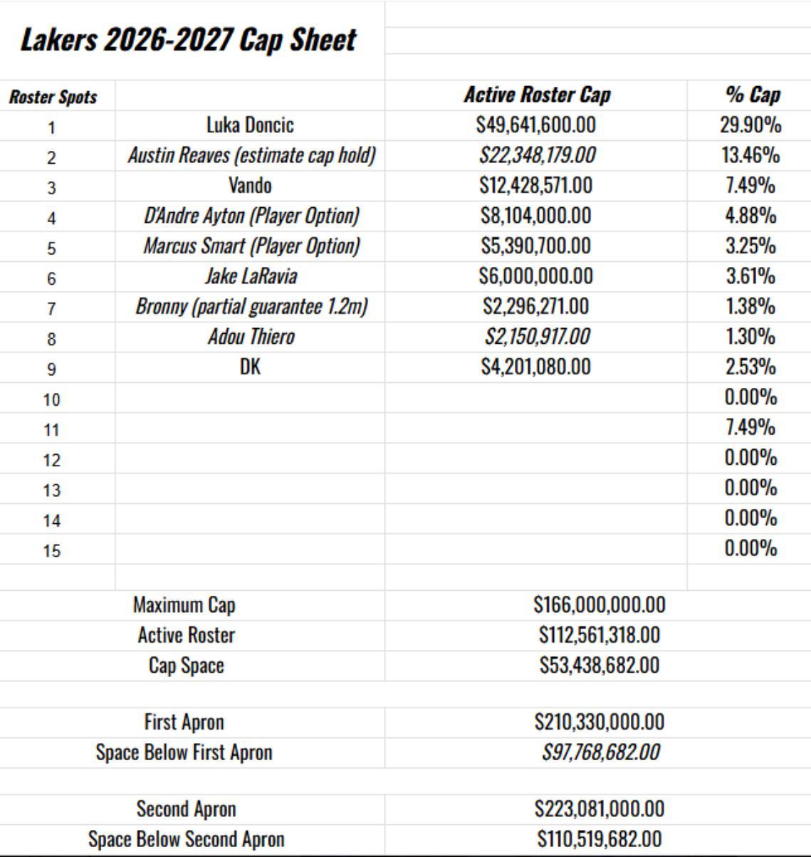 湖媒Tony Vega寫道:2026年夏詹姆斯可以釋放5950萬的空間,八村壘則可以釋放2730萬的空間,如果湖人不再留用詹姆斯、八村,那麼湖人在2026年夏就有足夠的薪金空間來運作。