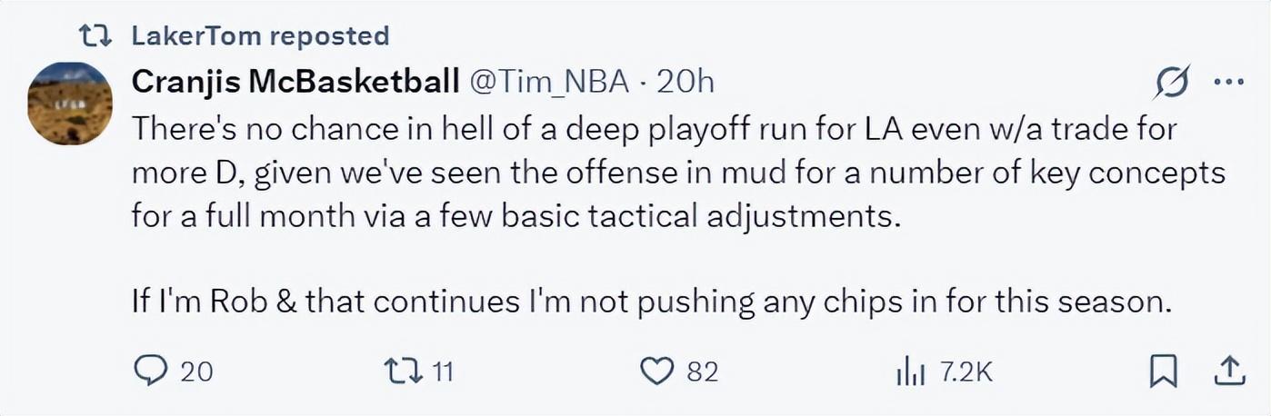 美媒CMB寫道:就算LAL交易得到更多防守球員我也不覺得他們能在季後賽中取得成果。因爲過去一個月我發現這支湖人不僅是防守差,他們的進攻體系在多個關鍵方面都出現了嚴重的問題,而這些問題不是一些基礎的戰術調整就能改變的,如果我不是佩林卡,這些問題在交易截止日前解決不了,我是不會進行任何交易投入的。